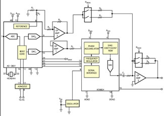 50MHz晶体振荡器为DDS提供基准时钟信号。DDS的输出级是一个以外部电阻为负载的电流输出DAC。一个200Ω的电阻可产生所需的峰-峰电压范围。DDS的输出端是通过电容器C1实现交流耦合的。这种Micro Converter内含两个片上12位DAC。DAC1通过R5改变电流,从而可通过FSADJUST引脚调整DDS的满刻度电流。控制DDS DAC满刻度电流的公式是:IOUT(满刻度)=18×I×R5。DAC、Micro Converter的内部基准和运放2用来对DDS的输出电压进行失调控制。你可对达到±10V的这一直流失调电压进行编程,分辨率为10位。当R1=R2,运放2的增益为8时,运放2的输出为:VOUT=[DAC输出 - (VREF/2)]×8,从而可获得±10V的失调范围。