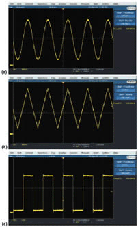 图2 正弦波(a)、三角形(b)和方波(c)三种波形均可从图1所示的电路中获得。这三种500kHz波形全都使用50MHz采样频率。