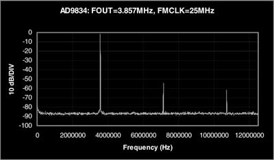 电阻器R6 ~R9用来控制运放3的增益。运放3的增益视上述电阻的接入与断开情况而定,而上述电阻的接入与断开则是利用Micro Converter上的RDRIVE引脚来实现的。这一操作可使可编程有效输出振幅达到±10Vp-p。因此,该电路可输出编程的正弦波和三角波,其中包含直流失调电压,并能设定大约±10V的峰-峰振幅。SIGN-BIT-OUT引脚上的方波输出信号具有0~5V的振幅。低频工作时,低通滤波器通常用来滤除基准时钟频率、寄生信号和其他镜像信号。 对于输出信号需要放大的应用来说,你应在增益级之前使用窄带滤波器滤除不希望有的噪声。一个三阶滤波器足以滤除大多数这种无用噪声。图3示出了输出信号的典型频谱图。该电路应用范围很广,从信号波形产生到数字调制,不一而足。你可将该电路用于扫描设备以及将频率作为激励信号来确定电路谐振的谐振设备。另一种应用是用作DLL系统的基准振荡器。