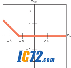 因为IC2B的倒相输入端连接到电流源的输出端,所以反馈二极管D1对I1来说是正向偏置的。这一正向偏置的二极管使IC2B的输出端保持在大的-0.6V。由于D2的阴极端通过R3而处于虚拟地电位,所以D2仍然是反向偏置的。 因此,VOUT仍然是虚拟地电位(0V)。任何正电压加到引脚VIN上,都进一步使D1和D2分别正向偏置和反向偏置,VOUT在VIN>0V时仍然处于0V(静带区)。