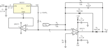 静带电路应用于伺服系统中。一个精密电流源和一个半波倒相整流器可构成一种正静带电路(图1)。REF01,即IC1,是一个10V精密电压基准。它配上一个单位增益缓冲器(IC2A)和电阻器R1,即可构成一个精密电流源。IC2A迫使IC1的接地引脚(引脚4)处于IC2A正相输入端的电位。IC1使其高精密10V基准电压加在R1两端,所以流过R1的电流I1为10V/R1。