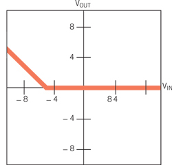 负的输入VIN往往使D2正向偏置,而使D1反向偏置。这种偏置情况只是在流过R2的电流(因为VOUT为负的缘故)等于或大于10V/R1时才会发生。所以,在VIN达到等于-10R2/R1的电压值之前,输出VOUT一直为0V(静带)。如果选用R1=20kΩ,则在VIN>(-5V)时,VOUT仍然为0V;在VIN≤(-5V)时,VOUT=(-VIN-5V)。