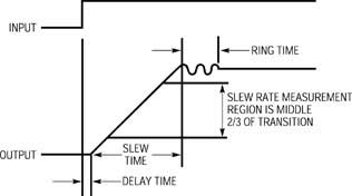 图1,放大器动态响应包括延迟时间、转换时间和振荡时间三部分。通常在中间三分之二转换时间内测量转换速率。