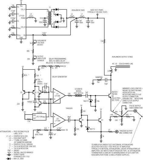 优化这一电路的第一步是将输出振幅游标调到最大值,并将 Q4集电极接地。然后,调整雪崩电压,使自激脉冲开始出现在 Q5发射极,同时注意偏置测试点电压。再重新调整雪崩电压,使之比这一电压低 5V,并使 Q4集电极不接地。设定30纳秒微调,并使触发器输出在时钟脉冲变为低电平后30纳秒变为低电平。调整延迟编程控制器至最大值,再设定300纳秒校准量,以使U1在时钟脉冲变为低电平后 300 纳秒变为高电平。由于有轻微的相互影响,必须反复调整30 和 300 纳秒这个微调量,直到两点都校准为止。
