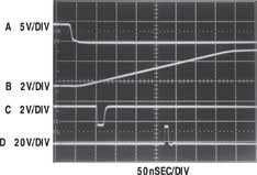 图4,脉冲发生器的波形包括时钟(迹线A)、Q2的集电极斜坡(迹线B)、触发输出(迹线C)以及脉冲输出(迹线D),延迟确定了输出脉冲发生在触发输出之后大约170纳秒。