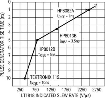 当试图准确地测定转换速率时,脉冲发生器上升时间的局限就成为一个重要的问题,这已被增益为1的放大器对不断加快的脉冲发生器上升时间的响应所证明(图 2)。数据显示,当脉冲发生器上升时间缩短时,转换速率呈非线性增加。转换速率随发生器上升时间的缩短而不断增大,虽然正在接近于零上升时间确定的边界,但却暗示信号源尚未驱使放大器达到转换速率的极限。要确定是否满足这一条件,就需要一台上升时间快于 1 纳秒的脉冲发生器。