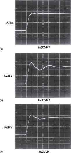 要获得最好的雪崩性能,就要择优选择 Q5。尽管器件的特性规定了雪崩性能,但制造商不能保证这种性能。我们最近做了一个选择试验,30支 Semelab 2N2501 样品管的日期标码分布在 17 年里,最后的选中率约为 90%。所有“良好”的器件开关时间均低于 475 皮秒,有些甚至低于 300 皮秒。也可以选包括飞利浦半导体公司和 Central 半导体公司在内的许多厂家供应的 2N2369代替2N2501,不过2N2369的开关时间很少低于 450 皮秒。实际上,应该根据低于 400 皮秒的在线上升时间来选择 Q5,然后通过调节Q5集电极的阻尼状况,对转换速率测试用的输出脉冲波形进行优化。这种优化方法可以充分利用转换速率测试不需要纯净的脉冲这种自由。 图5,过量阻尼牺牲了上升时间,迹线的前拐不错,减小了脉冲顶部的失真(a);最小阻尼会突出上升时间,但脉冲顶部振荡过量(B);优化的阻尼阻止了脉冲顶部的振荡,使上升时间保持在转换速率测量范围内(C)