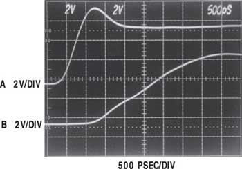 图6,迹线A的360皮秒上升时间脉冲使其在放大器(迹线B)开始偏移之前完成了转换。由于1GHz测量带宽限止了看到的响应,所以迹线A的上升时间实际上比描述的要快大约150皮秒。