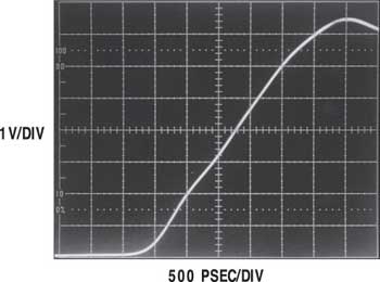增益为1的放大器在 1 GHz 实时带通内对 360 皮秒上升时间脉冲的响应示出了一个约为2800V/微秒的测量区转换速率(图 7)。这一测量值表明早期的评估误差为 11%(图 8)。