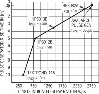 图2,脉冲发生器的概括数据显示了缩短的上升时间提升了更高的转换速率。验证转换速率的限制需要具有上升时间小于1纳秒的脉冲发生器。