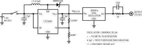 图A,1.5V电池为产生5纳秒时标的200MHz晶振供电,开关稳压器将1.5V转换成5V,为振荡器供电。