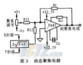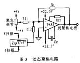 3. 典型应用 在平面的屏幕显示系统中,阴极到屏幕的距离随着它在屏幕上由左向右,由上到下的扫描而改变。因此,需要一个动态聚焦电路。普通的CRT屏幕由于有一定的曲率而不存在这个动态聚焦问题,而在平面屏幕显示系统中,这一问题就变得突出起来。要实现动态聚焦,首先需要一个高压高转换速率的运放,因为迅速的改变焦距对光束聚焦是很重要的。PA85可很好达到这种要求。图3为由PA85组成的动态聚焦电路的原理图。