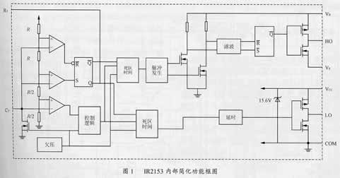 1.自激式半桥驱动器IR2153介绍 IR2153是在IR2155和IR2151基础上推出的改进型的VMOS和IGBT栅极驱动器,它将高压半桥驱动器和一个类似于555时基电路的前端振荡器集成在一个8脚芯片上,使其成为一款功能更多,更易于使用的功率驱动IC芯片。如图1所示,脚CT兼有保护关断功能,可以用一个低电压信号使驱动器停止输出。另外,输出脉冲的宽度保持相等,一旦Vcc上升到欠压闭锁阈值,驱动器能以更加稳定的频率开始起振。通过降低栅极驱动器di/dt的峰值和提高欠压闭锁阈值的滞后电压到1V,使电路的抗噪性有了实质性的提高,同时,电路引脚的整体抗噪保护方面也有所改进。