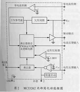 2. 功率因数校正电路 MC33262属于有源功率因数校正器,特别适用在电子镇流器和离线式开关电源中作预转换器用,如图2所示,其内部集成了许多控制功能:为便于该电路的单独使用而设有启动定时器;为实现接近于1的功率因数采用了第一象限乘法器;零电流检测能保证电路工作在临界导通方式;快速启动电路改善了电路的启动特性;还设有预校的参考电压源、跨导误差放大器和电流检测比较器;图腾柱输出结构非常适合用于驱动功率MOS管。此外,MC33262内部还集成了许多保护功能,如过压比较器能减少空载引起的失控输出电压;乘法器输出嵌位限制了最大峰值开关电流;驱动输出高位嵌位,实现了对MOS管栅极的保护;还有输入带滞后特性的欠压闭锁电路、连续限流特性和RS锁存为单脉冲测量等。
