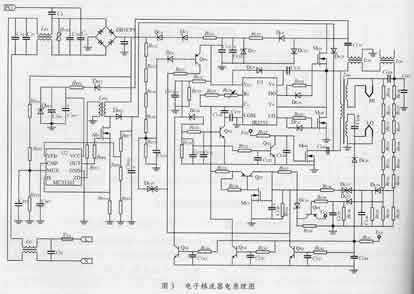 3. 电路工作原理 电子镇流器详细电原理图如图3所示,可分为EMI滤波、桥式整流、功率因数控制、半桥逆变器、灯谐振、启动和保护电路等部分。